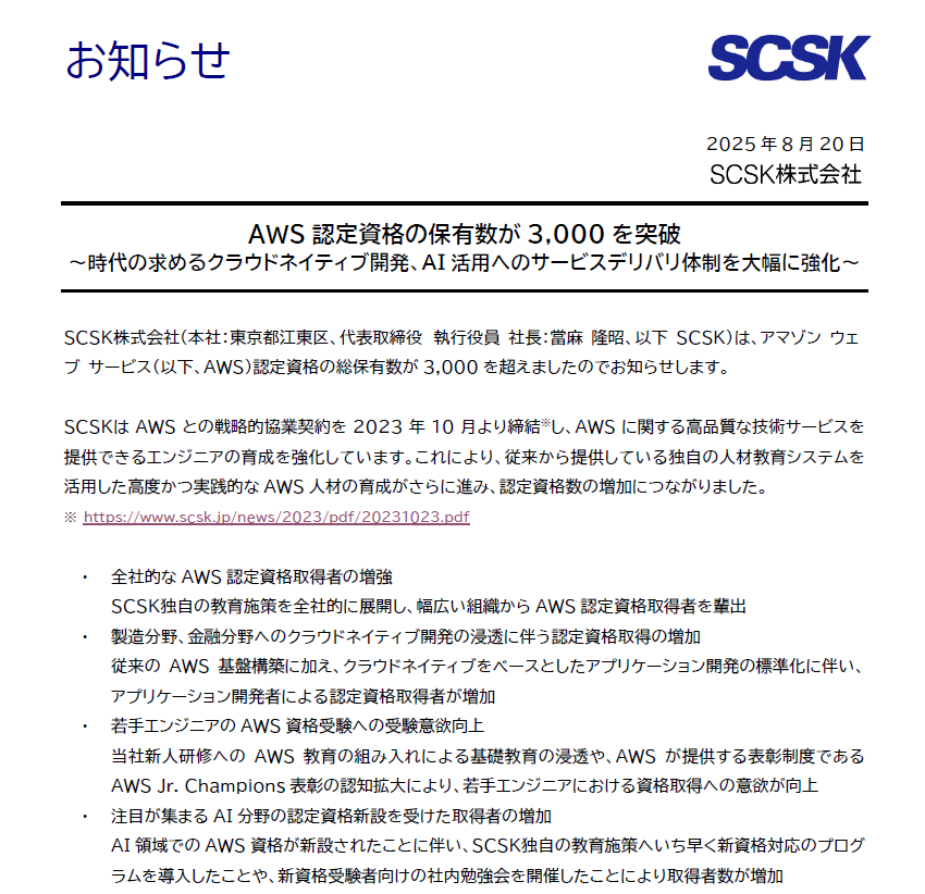 SCSKは、アマゾン ウェブ サービス(以下、AWS)認定資格の総保有数が 3,000 を超えました。各業界に精通したエンジニアが多岐にわたるお客様のご要望にお応えできるよう、今後も AWS 人材の育成を全社一丸で強化します。