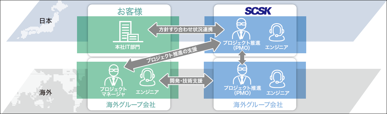 SCSKは確かなクラウド技術とグローバル企業としての経験に基づく国内外の支援体制を構築し、お客様のグローバルなクラウド活用を強力に支援いたします。