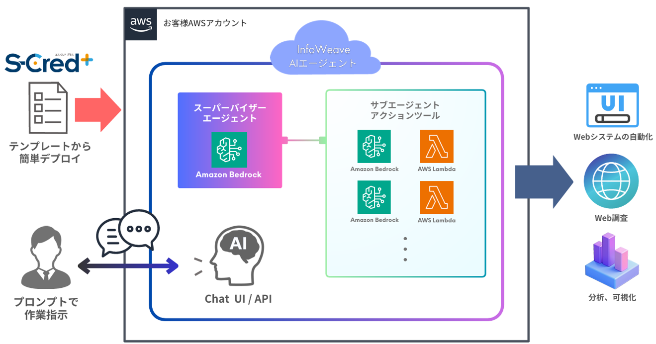 生成AIと業務ツールを連携させた"AIエージェント"を、AWS上に簡単・安全に構築できるテンプレートサービスです。複雑な設計や開発を必要とせず、自律的に業務をこなすAIの導入をスピーディに実現する仕組みをご紹介しています。