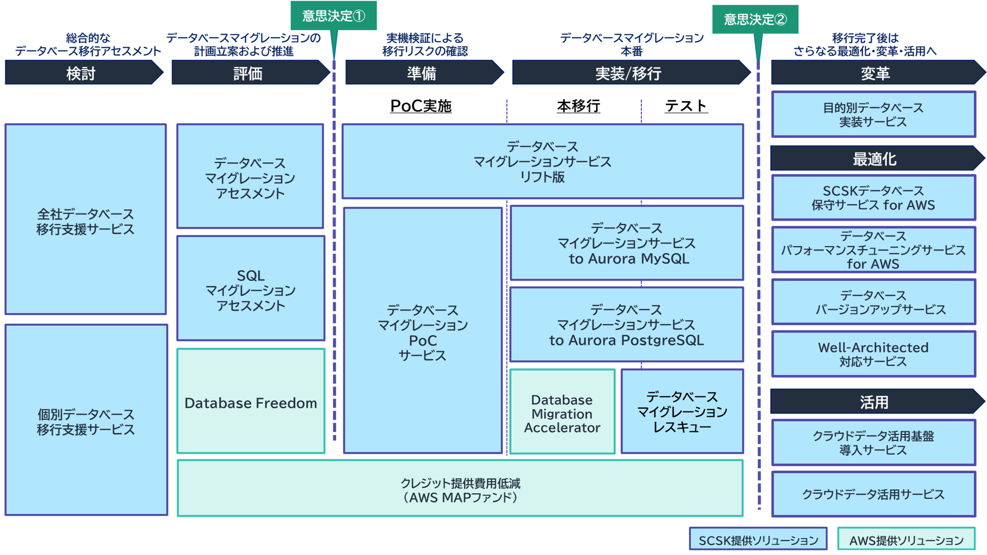 SCSKでは、データベースのAWS環境への移行について、全社のデータベースなど総合的なデータベースの移行アセスメントから、データベースの最適な移行を選定・実施、移行後の最適化、モダナイゼーション、データ活用まで幅広く対応が可能です。お客様のご要望にあわせ、必要なソリューションを提供いたします。