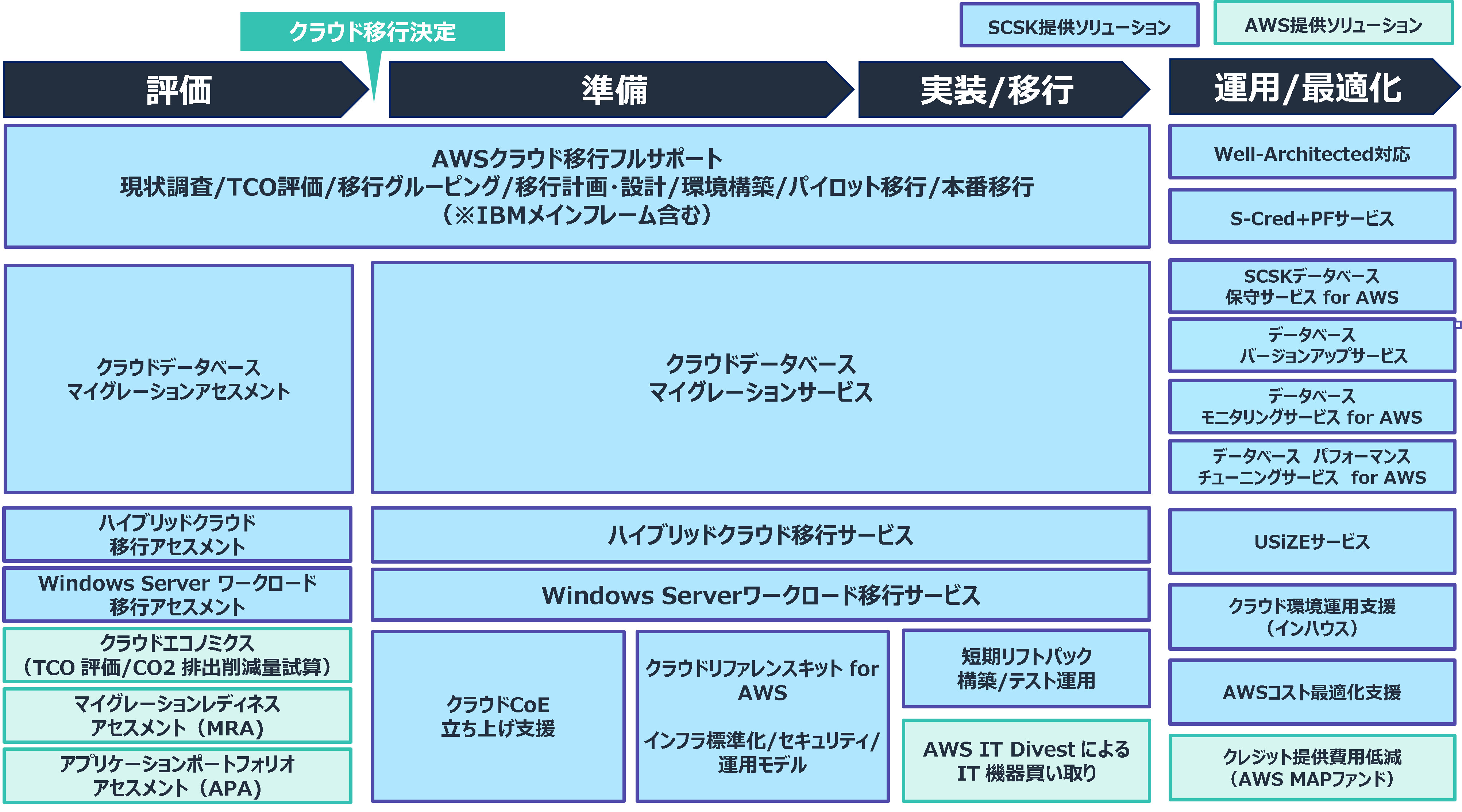 評価・準備・実装/移行に必要な機能に加え、運用/最適化まで対応しております。クラウド移行が初めてのお客様でも、フルサポートでご提供しているため、安心してご活用いただけます。AWSマイグレーションパートナーのSCSKの知見を活かした付加価値をご提供いたします。