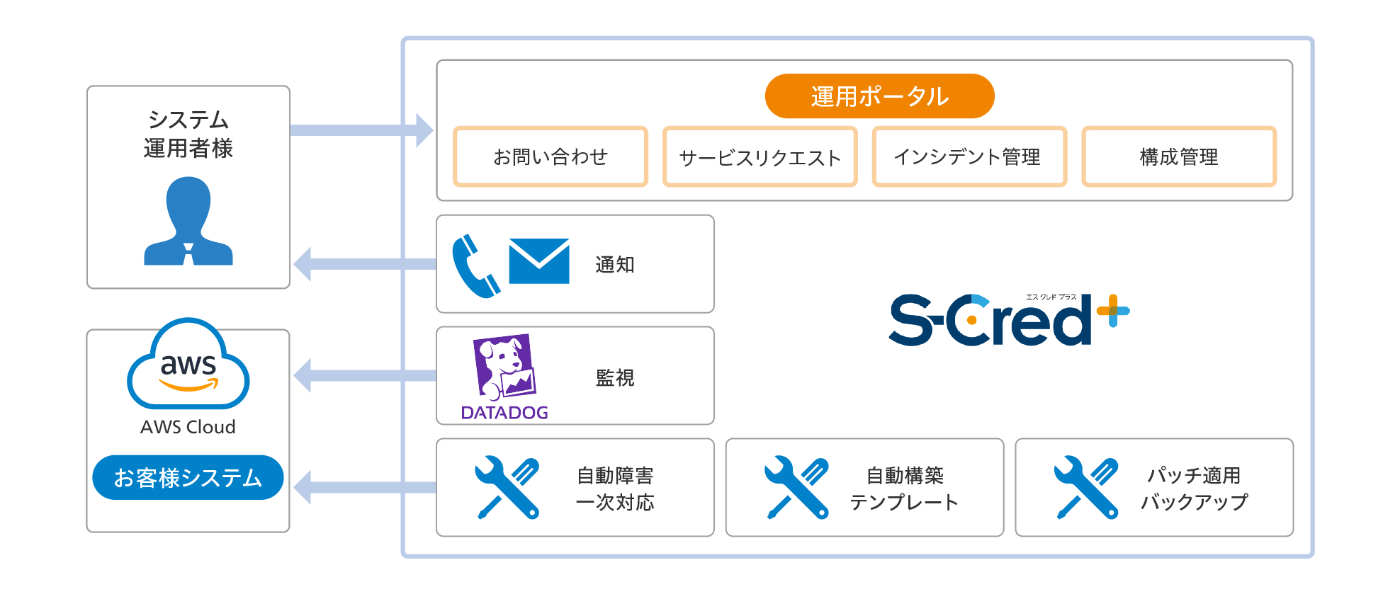 障害発生時の一次対応をはじめ、OSのパッチ適用の自動適用、構成管理・インシデント情報の可視化、サービスリクエストによるAWSの各種設定変更などの運用機能が、サービスに含まれています。