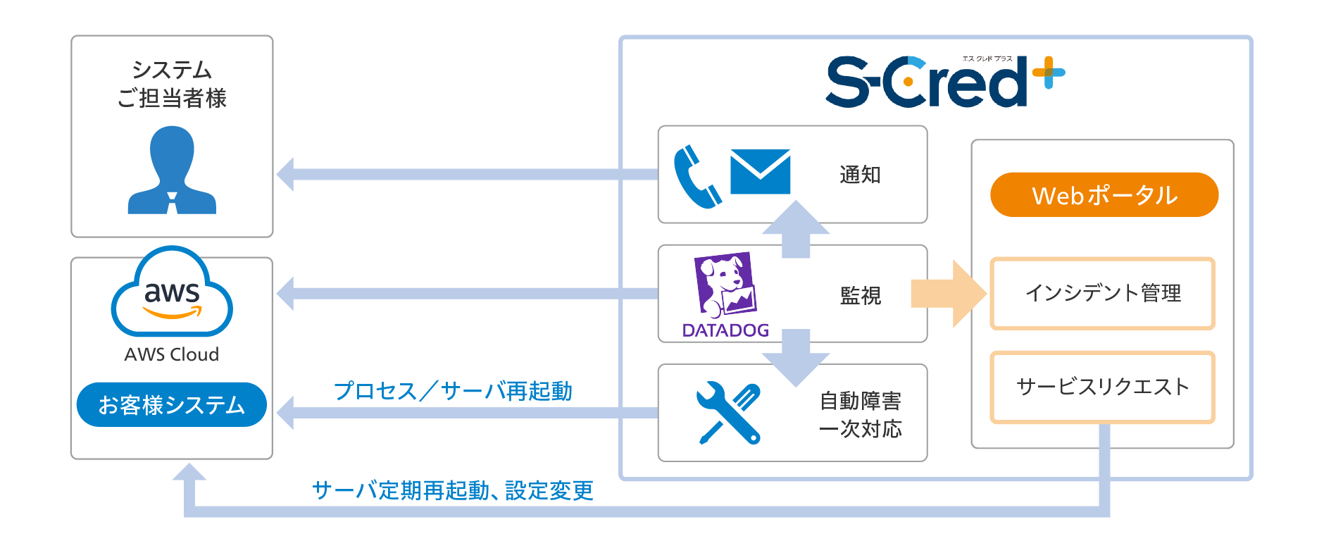 サービスリクエストの対応、プロセスやサーバの再起動といった障害一次対応、電話・メールでの通知はAWSのサービスにより自動化。コスト削減やアジリティ・品質向上に寄与します。