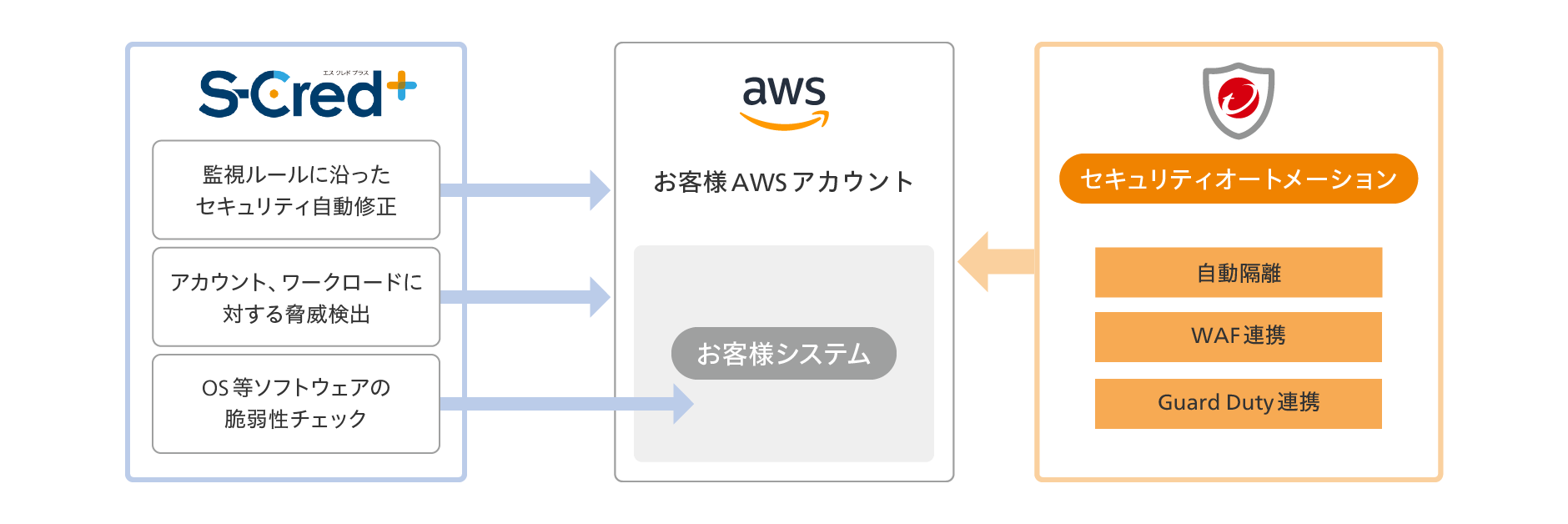 トレンドマイクロとAWSのサービスを組み合わせ、セキュリティインシデントの初動対応を自動化。また、セキュリティ上致命的な変更が検知された場合は、監査機能によって自動修復することで企業のガバナンスをサポートします。