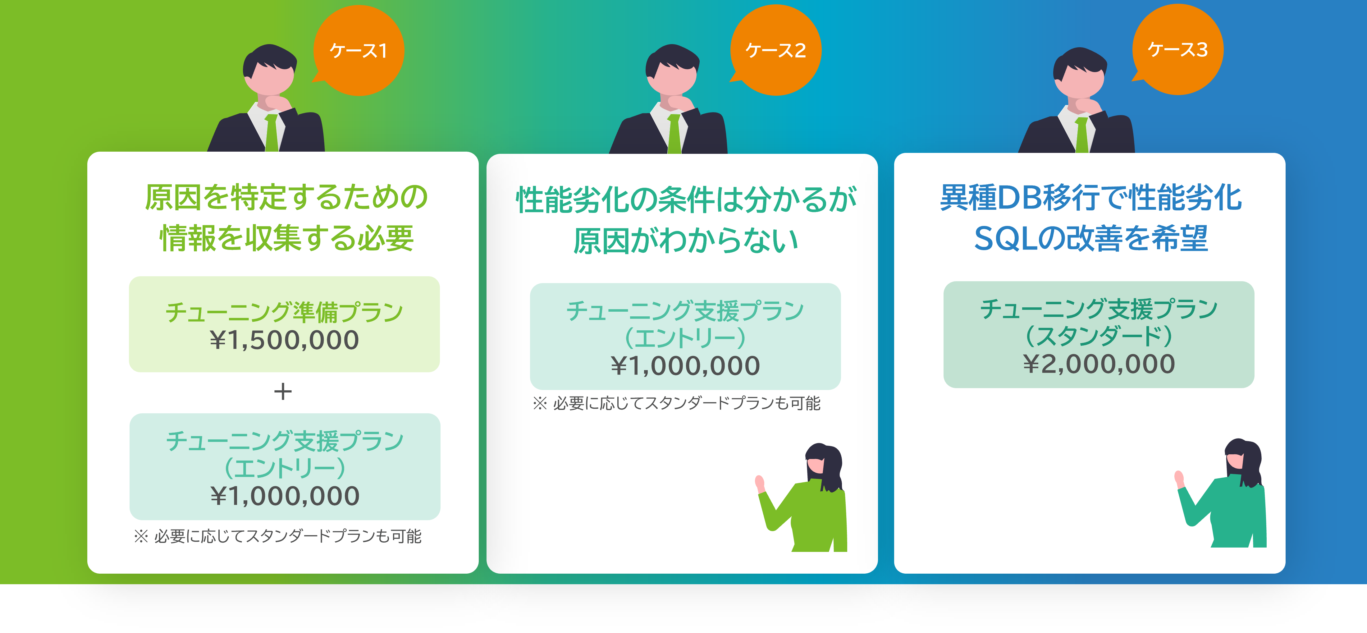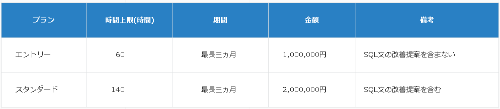 ヒアリングした性能劣化の条件を元に、リソース状況と各種ログ情報から性能劣化の原因を調査し、改善提案を行うプランです。スタンダードプランでは、SQLの解析、改善案の提示も含みます。