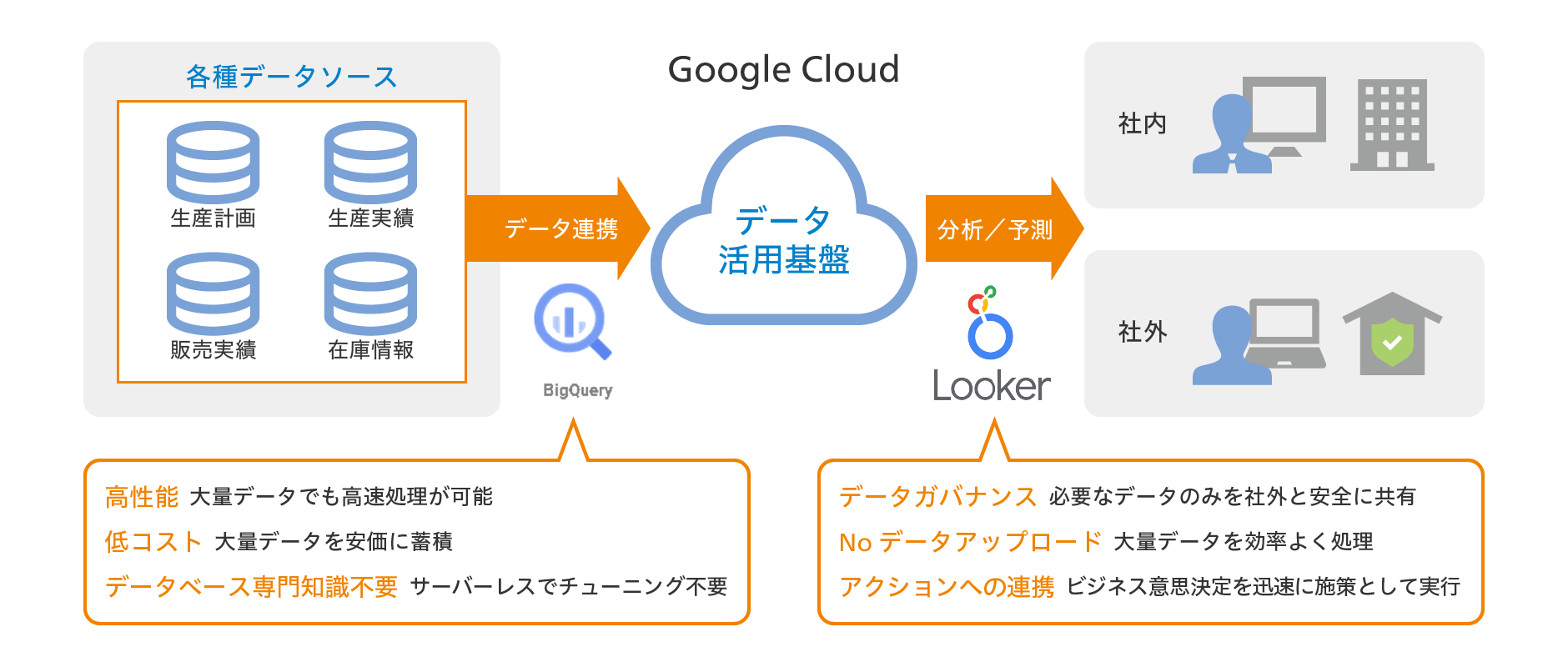 Google Cloudのデータ分析・活用基盤を活用し、社内だけでなく社外にも対象を広げることで、売り上げ増大、業務効率改善、精度向上などの促進につなげることができます。