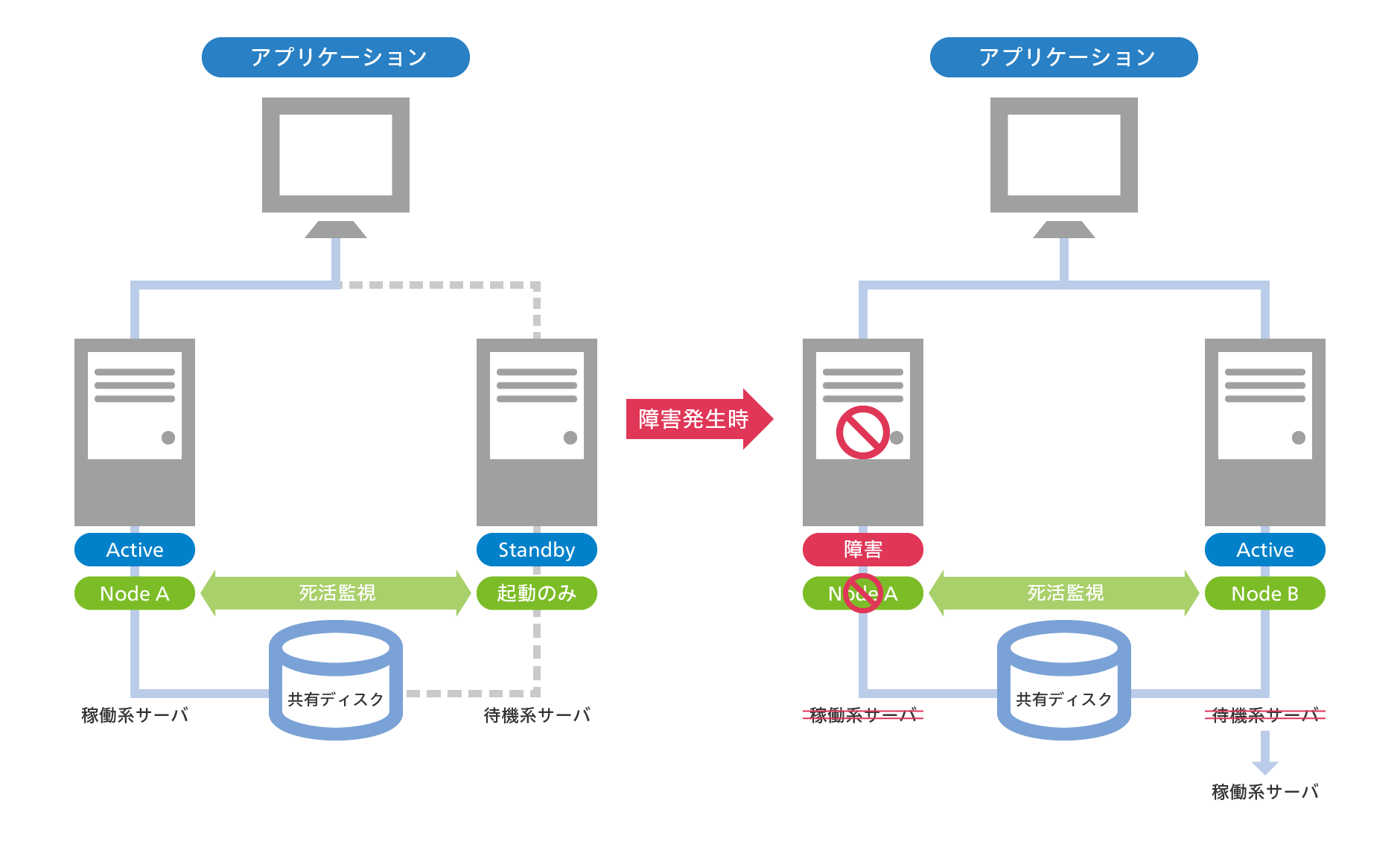 HA構成は、Active-Standby構成により、障害時の高可用性を実現するクラスタリングシステムです。