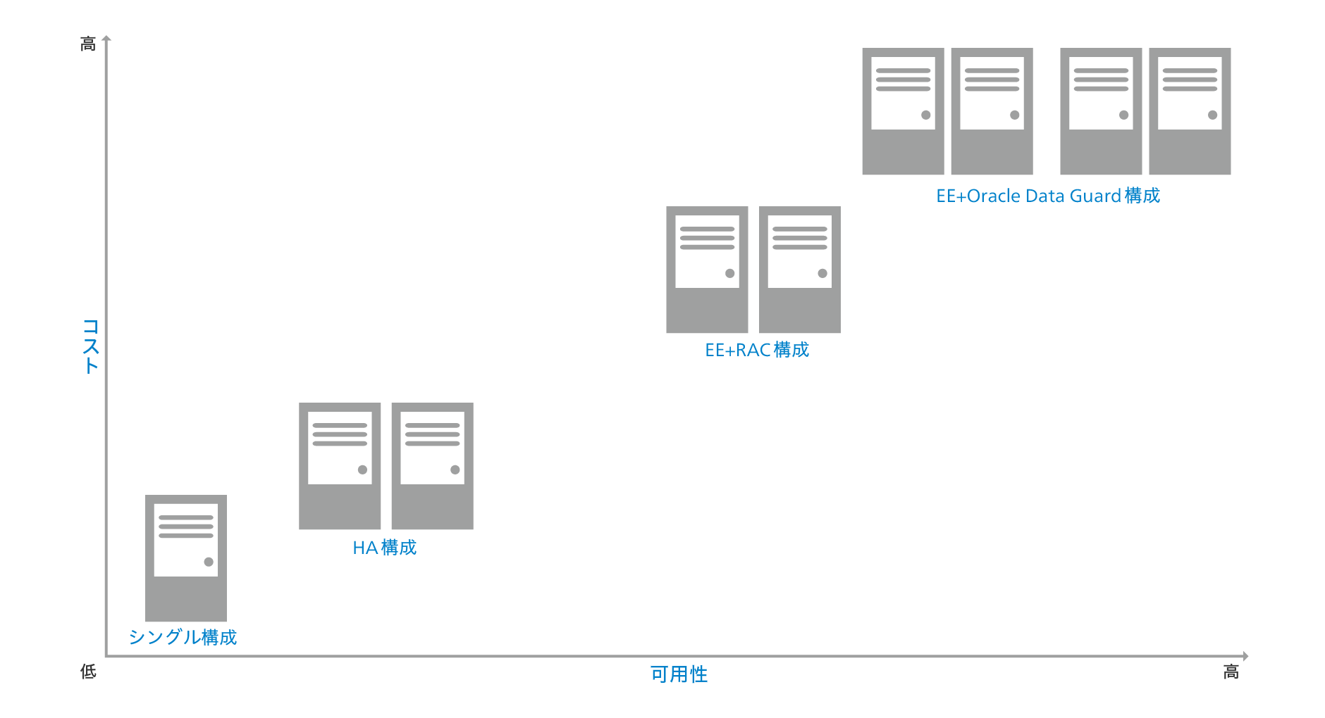 パフォーマンスや拡張性、ダウンタイムの有無など可用性に関する要件があがるにつれコストは高くなる傾向にあります。