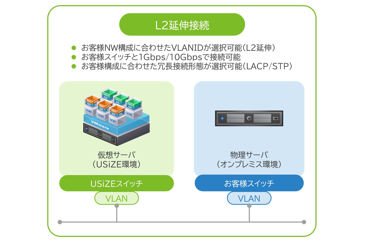 お客様ネットワークからUSiZE環境へレイヤー2接続(延伸)が可能なため、IPアドレス体系の変更が不要です。