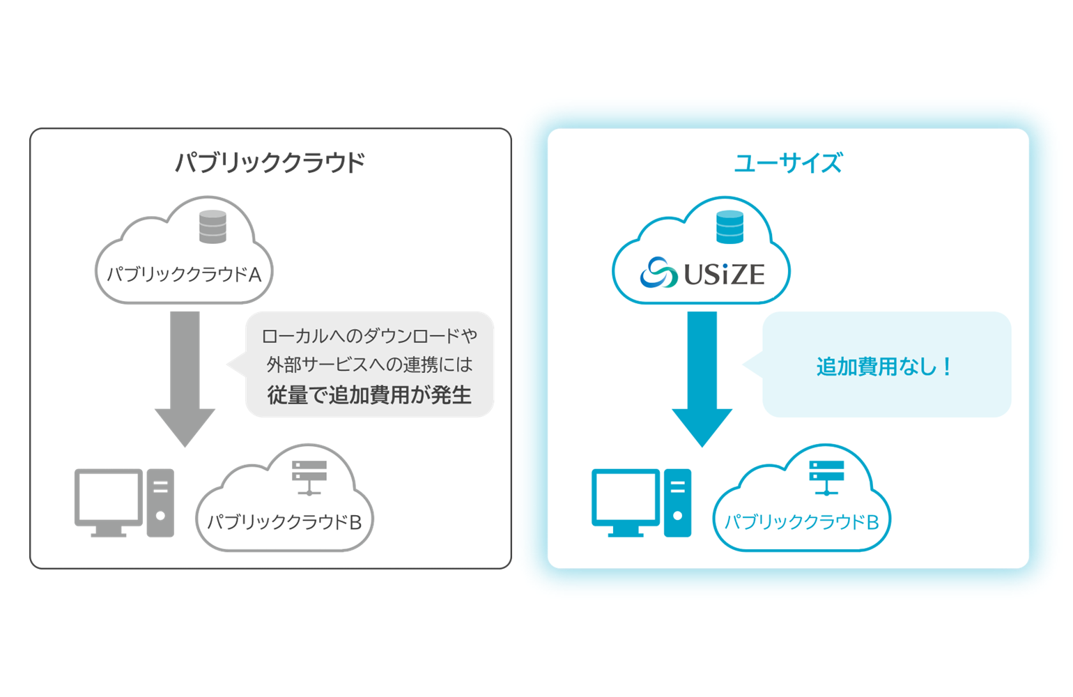 USiZEにデータを保管することで、ダウンロード時の従量課金が不要となり、回線サービス費用のみで利用可能