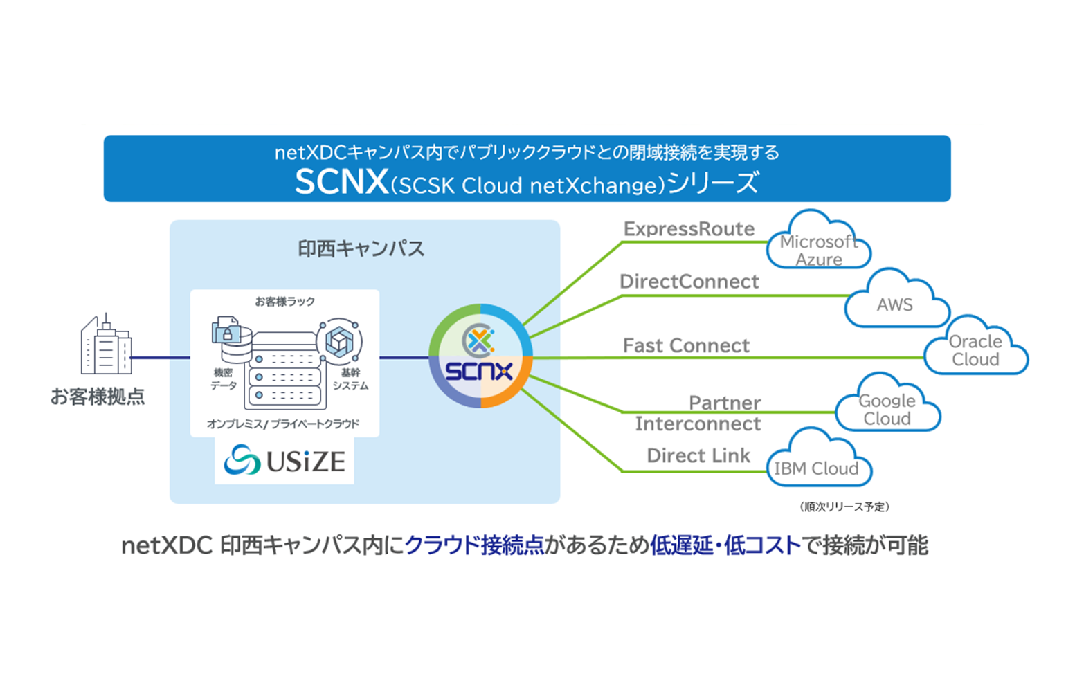 USiZEと各種パブリッククラウド間を、閉域ネットワークで高速かつ安全に接続できるSCNXを利用することで、快適なマルチクラウド環境を実現できます。
