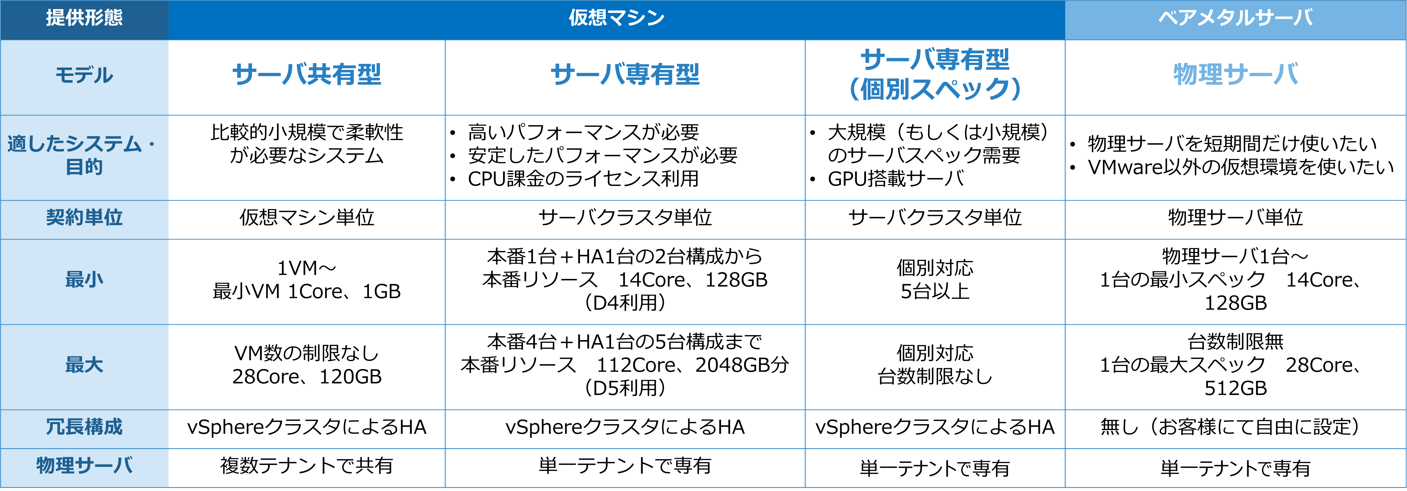 仮想マシンは、マシンスペックを細かくカスタマイズできるサーバ共有型・商用DBライセンスの持ち込みも可能な専有型マシン・ベアメタルサーバからお選びいただけます。OSはWindows、Redhat EnterpriseLinuxの現行バージョンはもちろん、OSサポート期限切れのバージョンもご利用いただけます。