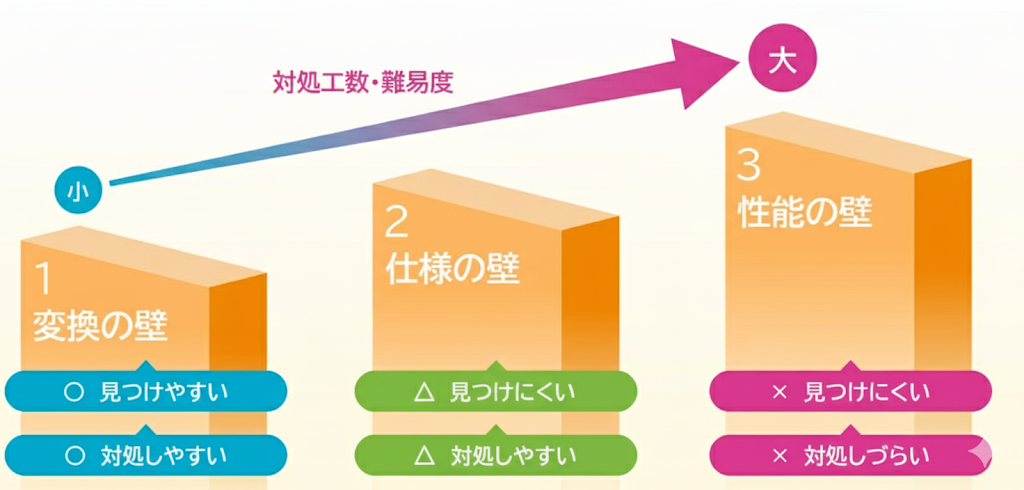 では、3つの壁がどのように移行に影響するのでしょうか。それぞれ見つけやすさ、対応のしやすさもふくめ解説していきます。