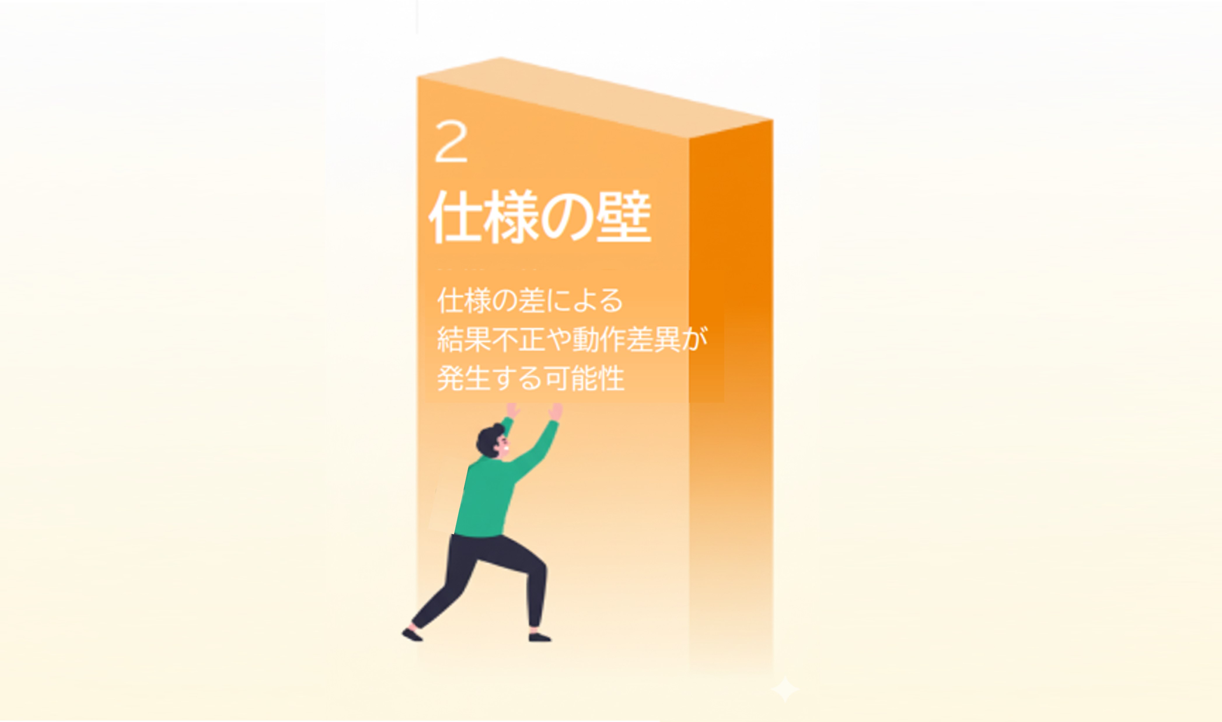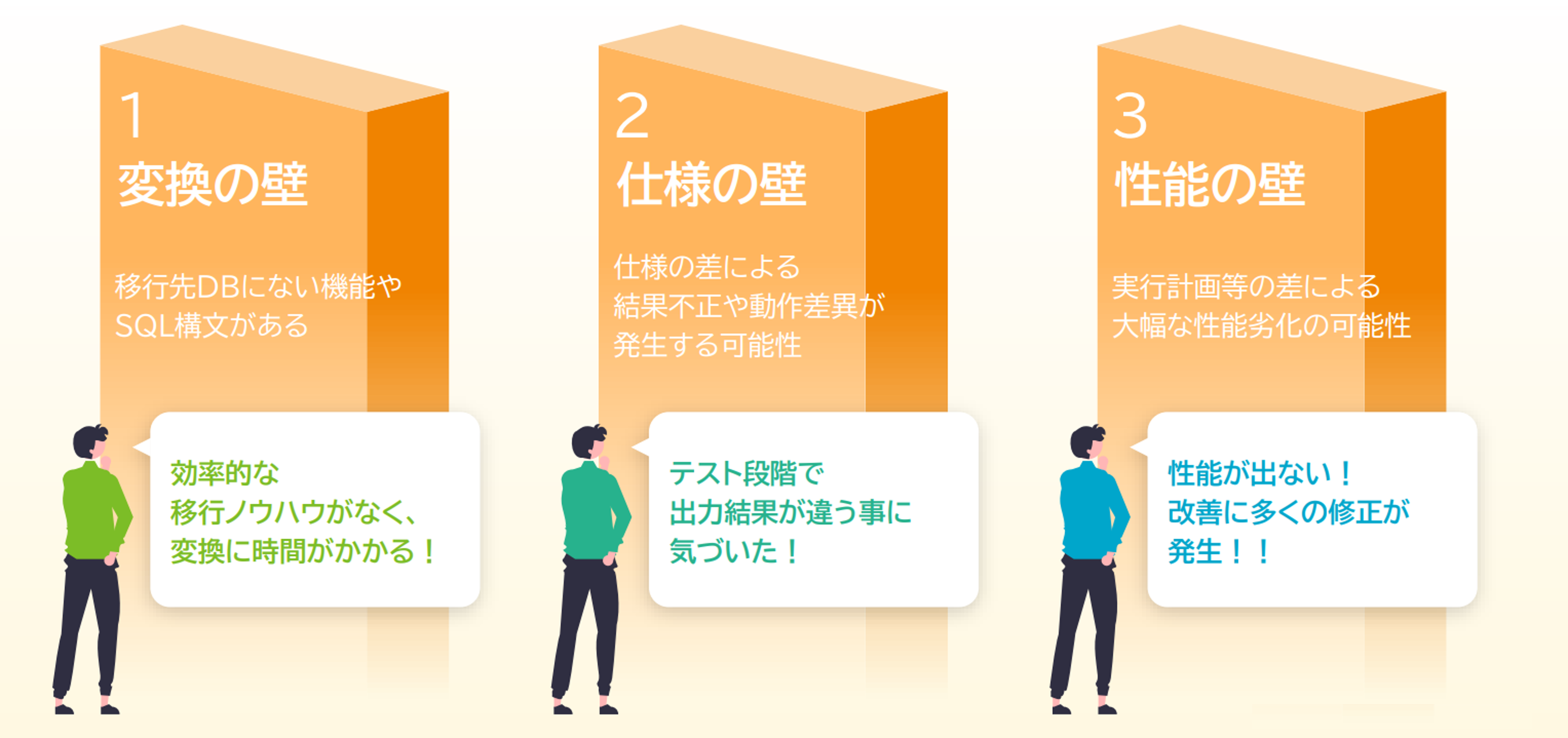 ここではまず全体像を整理してみましょう。移行時に立ちはだかるのは、大きく分けて「変換」「仕様」「性能」の3つの壁です。一見すると小さな違いでも、移行の成否を大きく左右する要因となります。