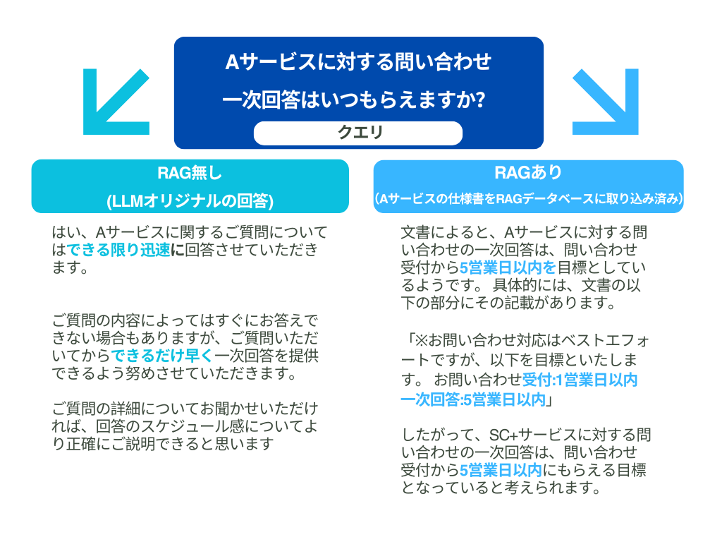 RAGが実際のビジネスシーンでどのような効果をもたらすのか、その違いを具体的な例で見てみましょう。ある企業のAサービスに関する問い合わせの回答を、RAG「なし」の場合と「あり」の場合で比較してみます。