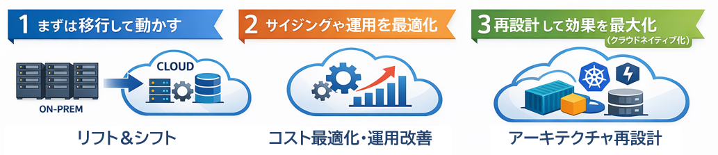 クラウド移行は、移せば終わりではありません。特に、そのまま移す移行(いわゆるリフト&シフト)は、必ずしもコスト削減に繋がらないことがあります。オンプレミスと同じサイズ感で動かし続ければ、使っていない時間も課金が発生し、むしろ割高になるケースもあるからです。