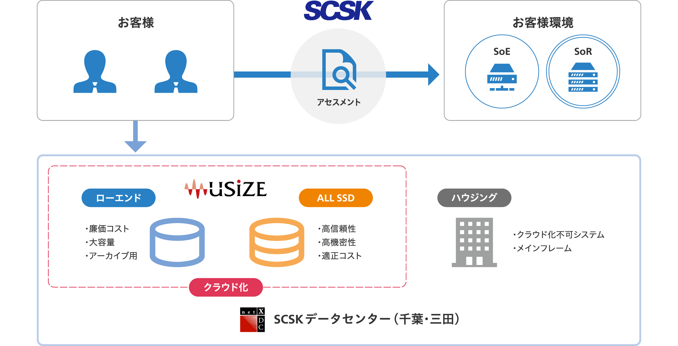 2025年の崖が近づき、レガシー化したシステムの運用保守や共通基盤のメンテナンスを行う人がいなくなることが切実な経営課題としてあげられます。SCSKではレガシーシステムの受け皿として、プライベートクラウド「ユーサイズ」を展開し、またクラウドリフトできないものはデータセンターへのハウジングサービスを御利用頂くことも可能です。