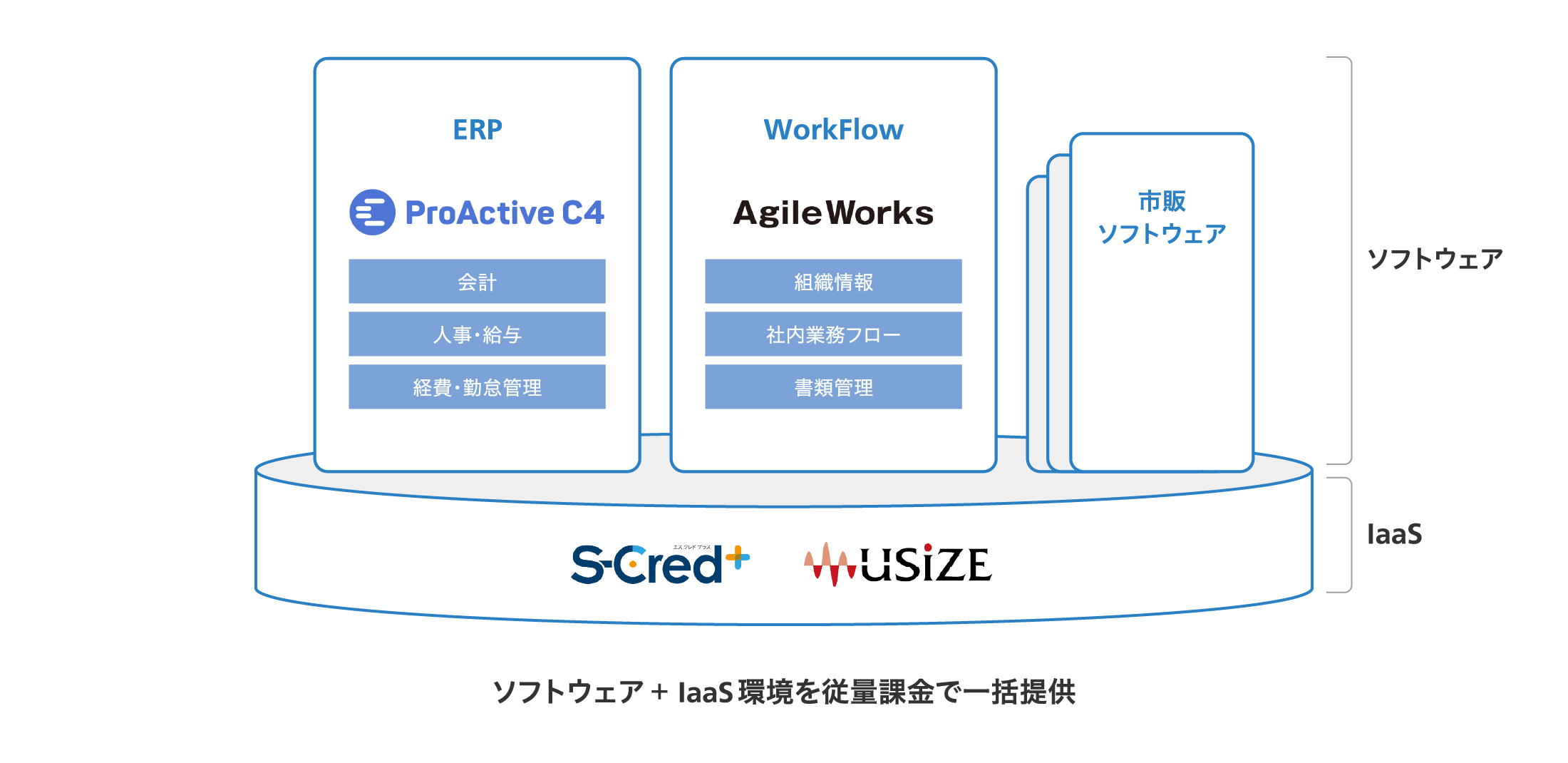 市販ソフトウェアを利用市販ソフトウェアを購入しようとすると高額なライセンスを一括で購入するケースが多いと思われます。SCSKのクラウドサービス「S-cred+プラットフォーム」「ユーサイズ」上にソフトウェアを展開し、インフラ環境とあわせて従量課金によるご利用が可能です。