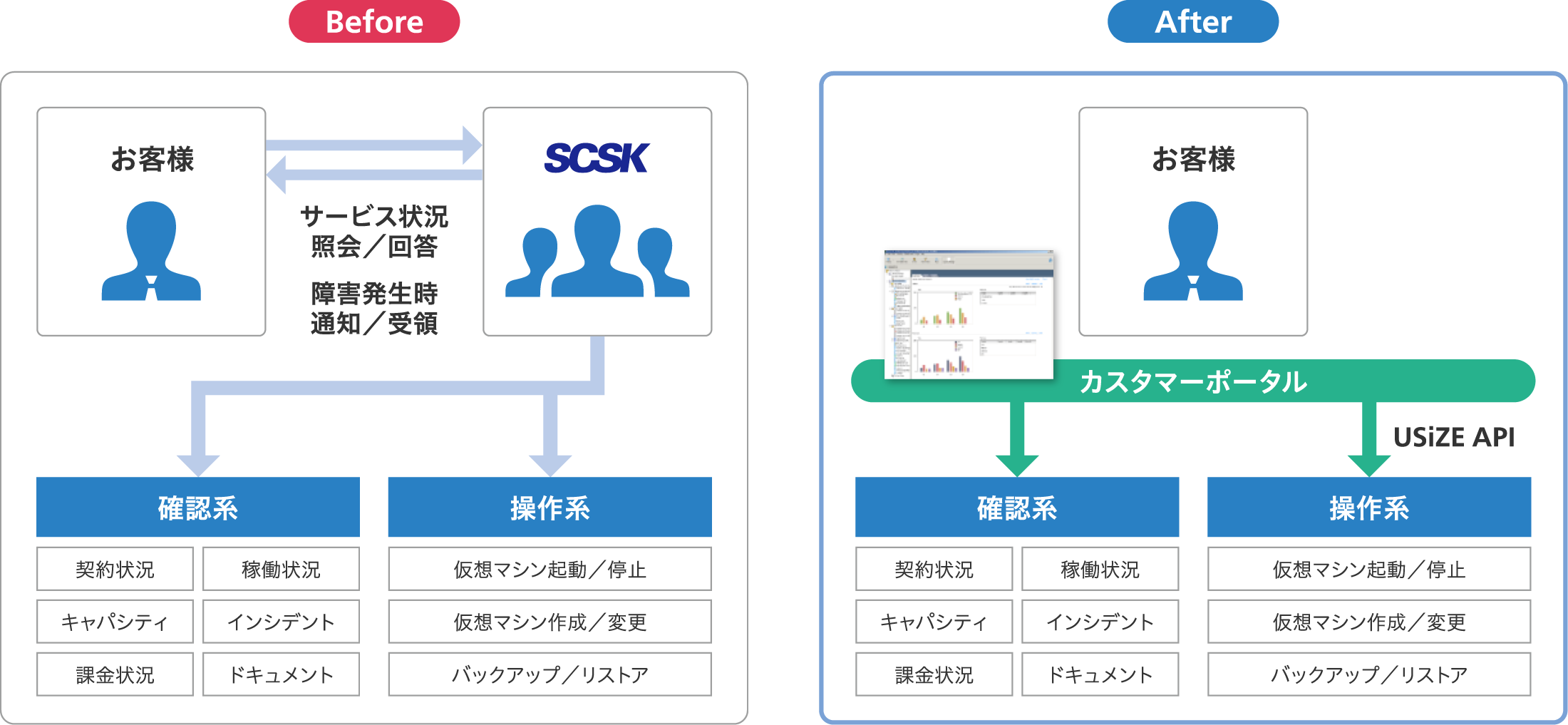 利用しているクラウド環境を自身で(=セルフで)運用したいお客様は多いと思います。SCSKのクラウド「ユーサイズ」では、お客様向けにダッシュボードを設け、リソースを必要な時に確認、操作することが可能です。